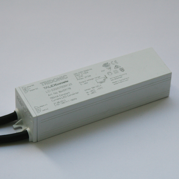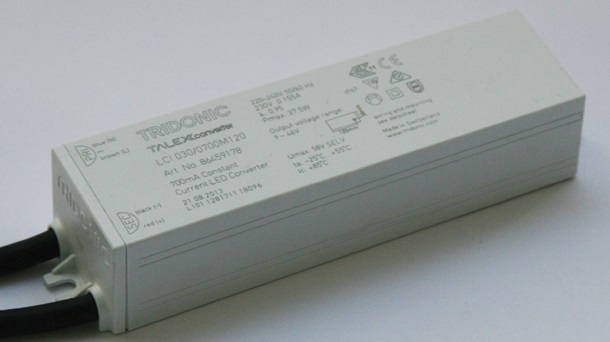 Driver led 37 Watt 700mA constant current potted IP42 Dimensions: 31mm(h) x 39mm(w) x 150mm(l) Cutout shape/size: 50mm V Out = 58 V DC I Out = 700mA DC P Out = 37W