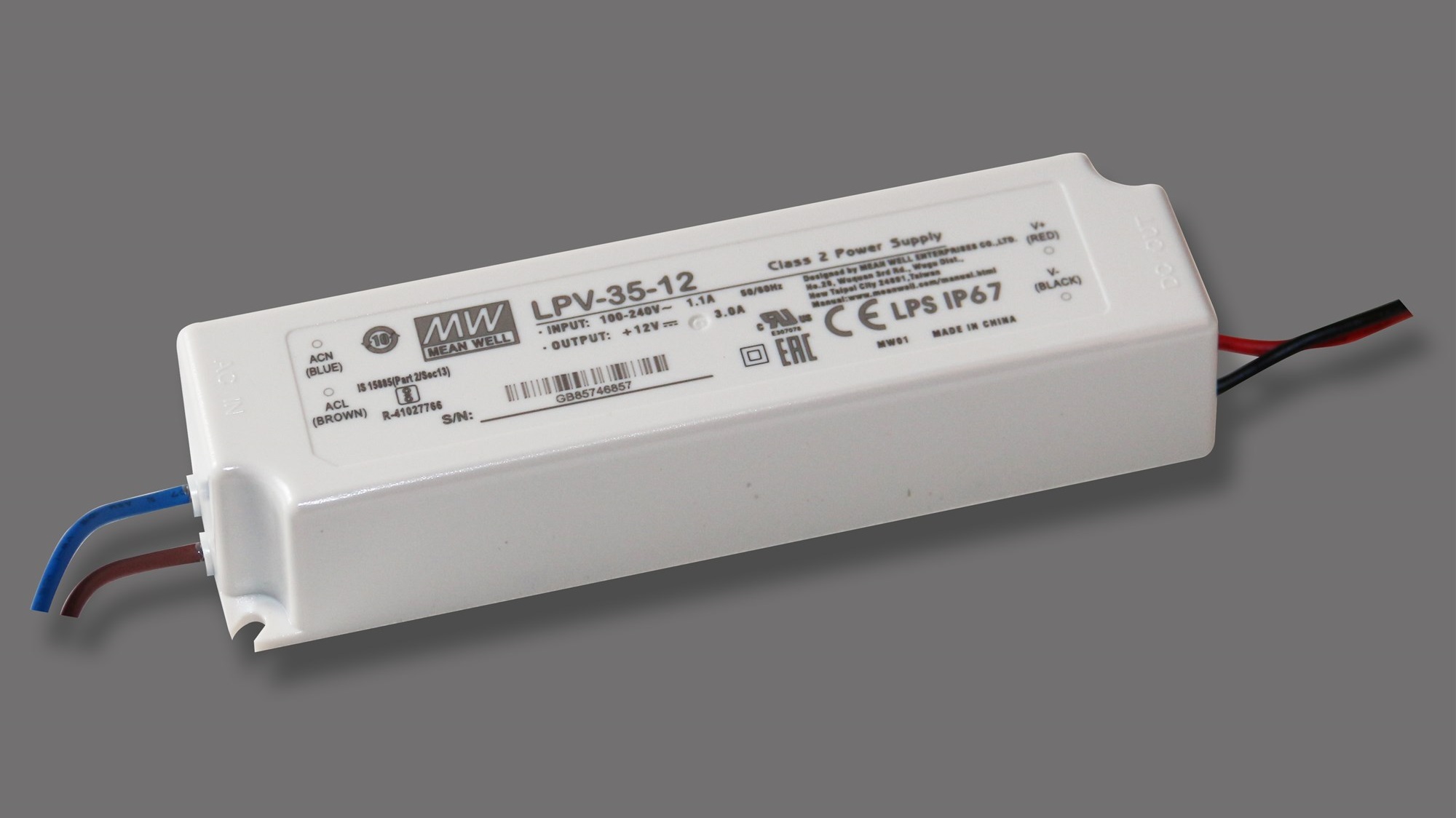 Power supply 35W 12V constant voltage potted IP 67 Dimensions: 30mm(h) x 40mm(w) x 148mm(l) Cutout shape/size: 55mm V Out = 12 V DC P Out = 35 W DC